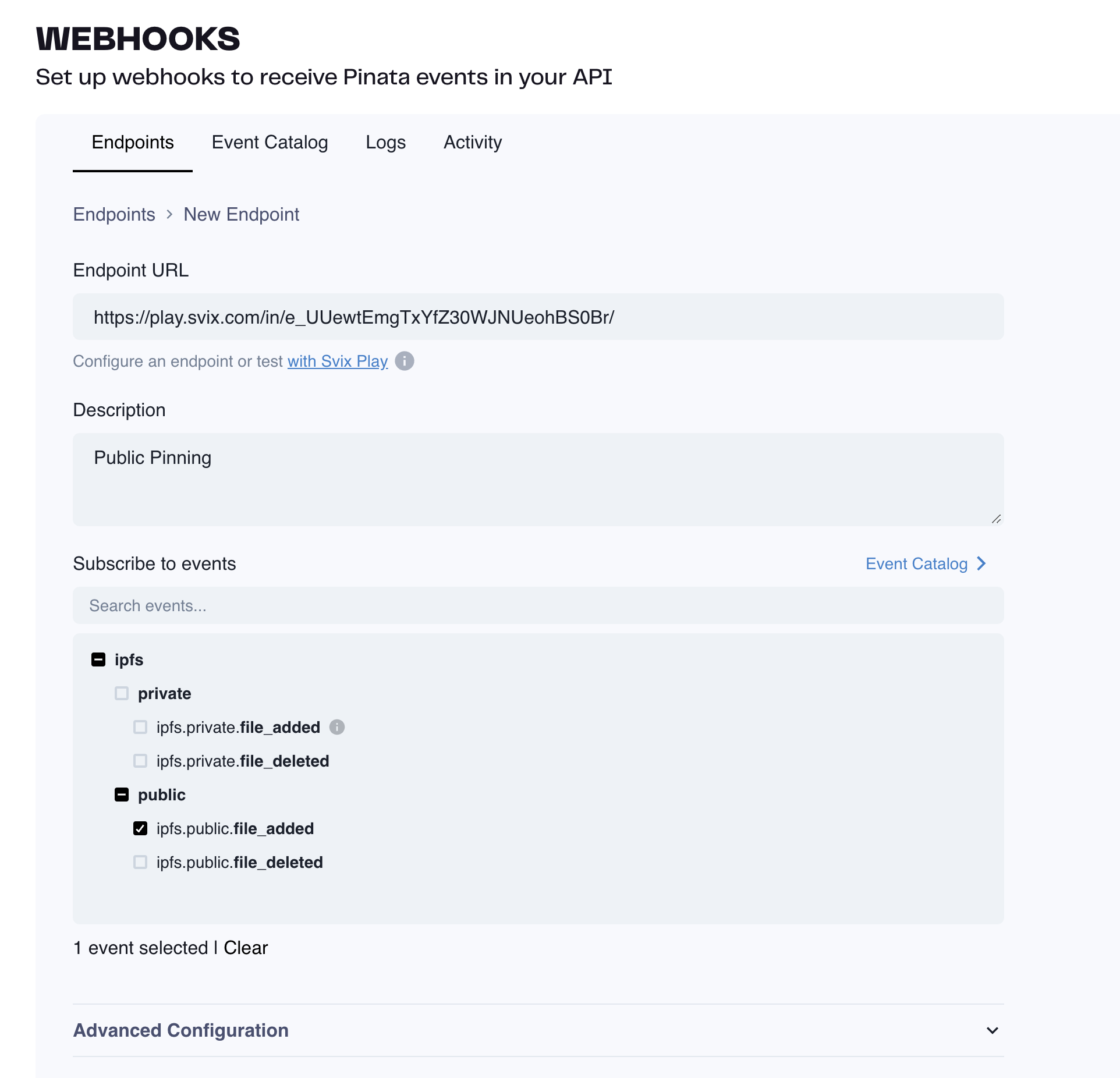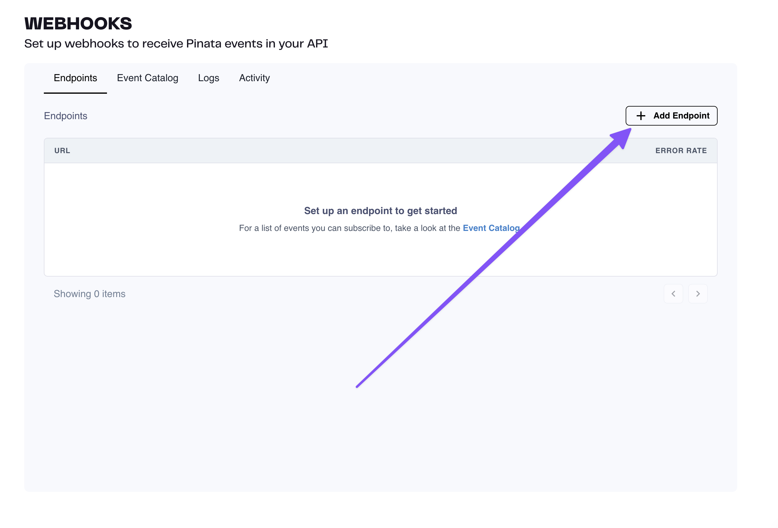 Navigate to the Webhooks Tab inside the Pinata App and click “Add Endpoint” in the top right.On the New Endpoint page you can put in a URL for your server endpoint that will receive the events. Additionally you can give it a description, which events it will subscribe to, and more advance options like rate limiting. Once you have your options selected click “Create” at the bottom.