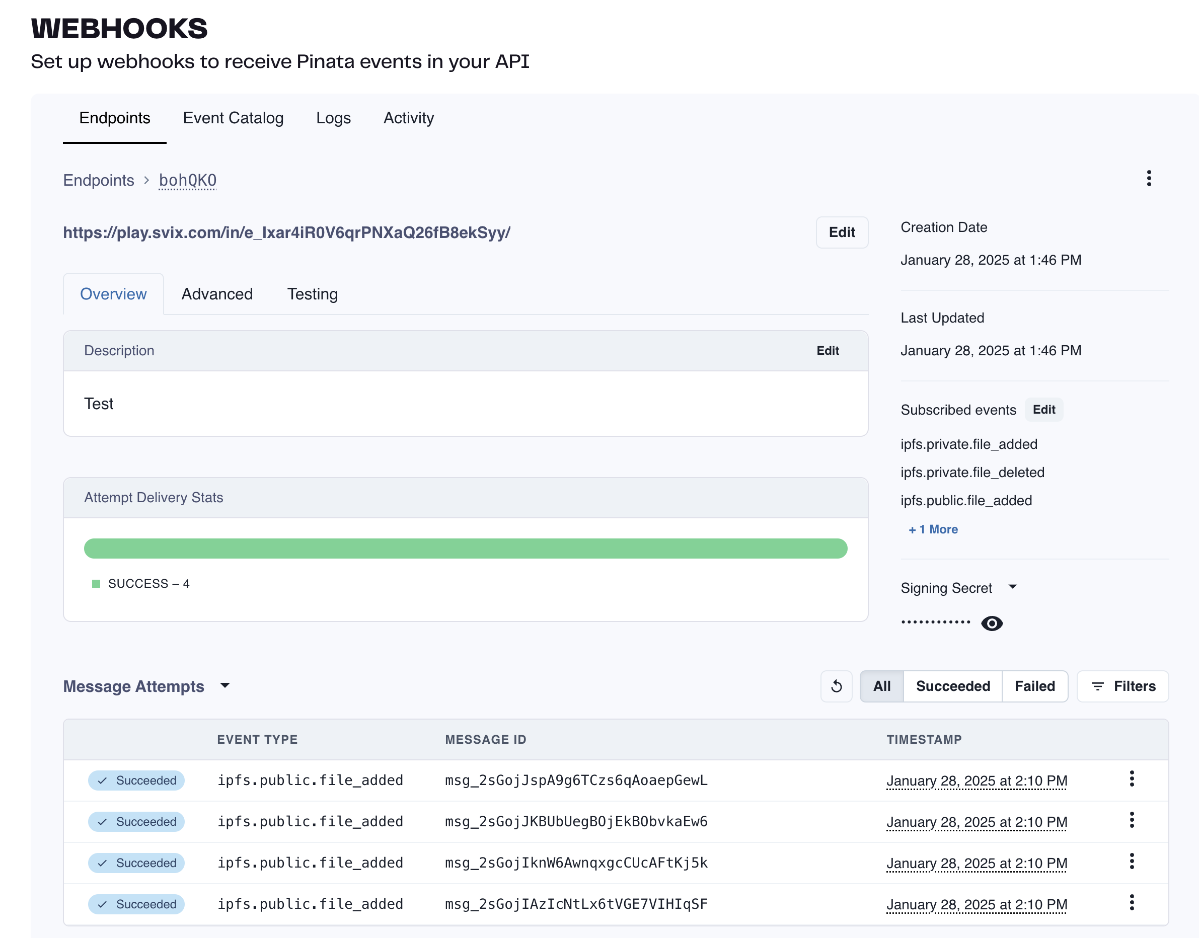 Once your Webhook is created you will be taken to the dashboard where you can see incoming logs and events that are fired. Try triggering one of the events that you’ve selected for your webhook either from the Pinata App or from the API. Then come back to the dashboard to see the result!