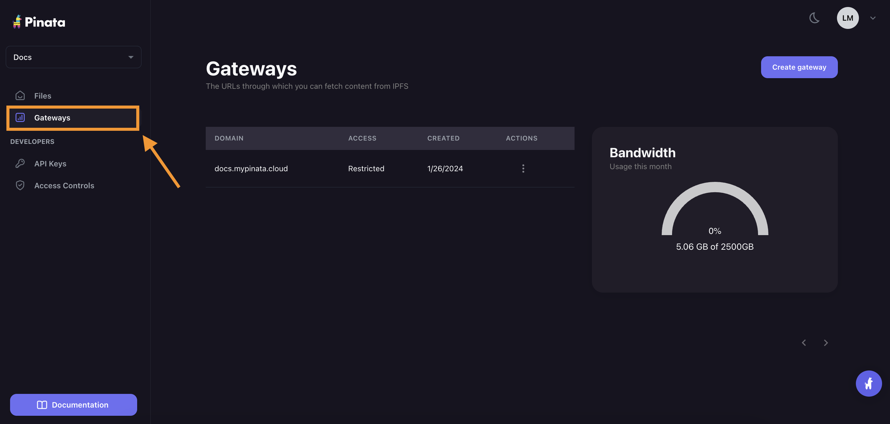 Pinata also allows you to create a custom domain for your Dedicated Gateway. Simply visit the Gateways Page, click the menu button on the right side of your gateway, then click Add Custom Domain. You’ll need to own the domain you want to use. When you enter your domain, you will be prompted to enter DNS information through your registrar.Retrieving Private Files