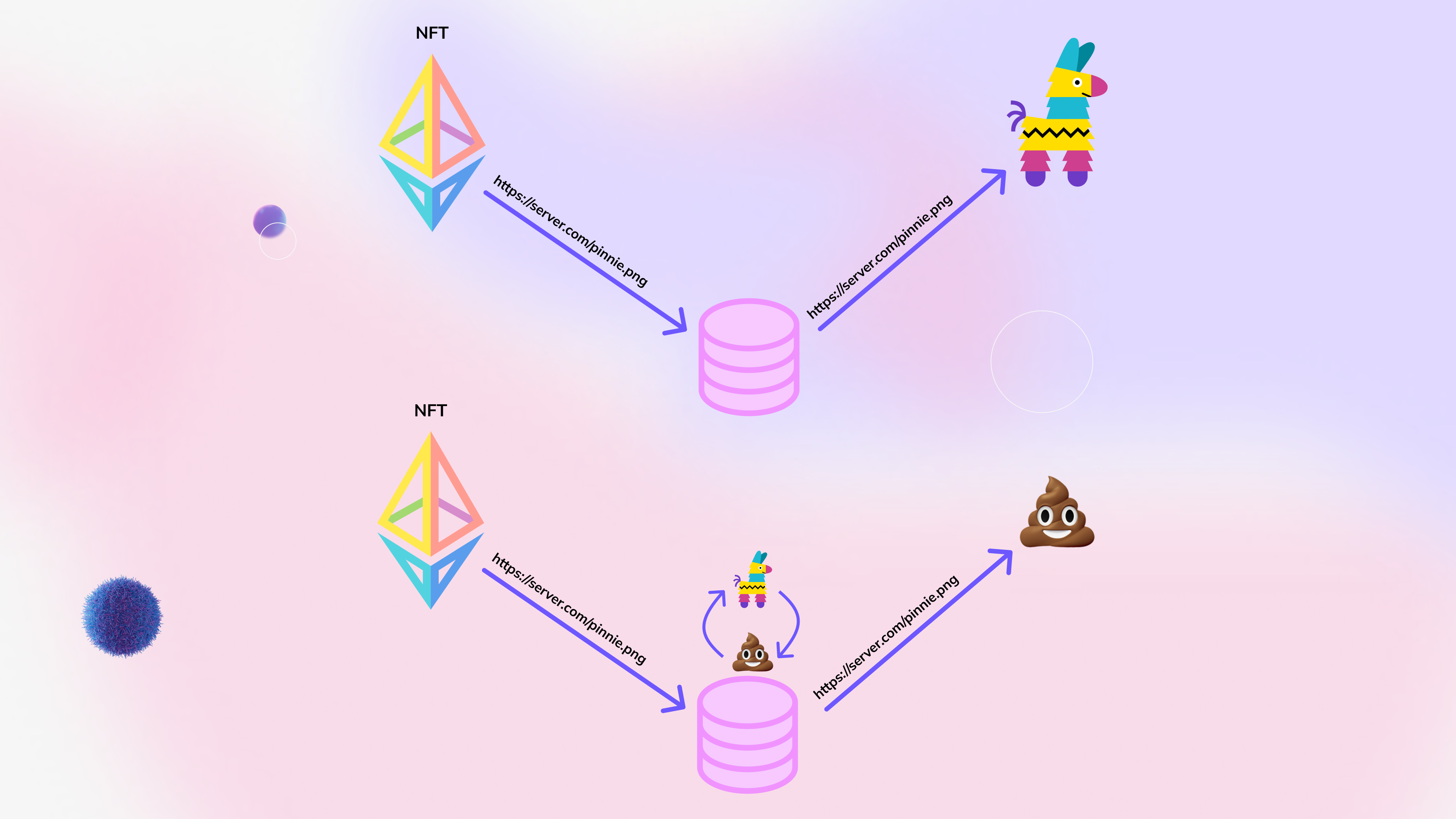 Blockchains have an incredible ability to keep a long ledger of transactions and who sends or signs them, however blockchains are terrible at storing data. Since blockchains require gas fees to be paid anytime data is stored on the blockchain, larger forms of data can cause astronomical prices. As of 2023, storing 1GB of data on Ethereum would cost around $250,000,000! This caused a problem in particular for NFTs as they were first taking off. NFTs, or really anything being used on the blockchain, will usually have a token element that is on chain that has a pointer to data off-chain (referred to as the token URI). This pointer is usually a link to a metadata file in the form of JSON, which has information like the name of the NFT, a description, and usually another link to an image that is also off-chain. Back in the earlier days of NFTs these pointers or token URIs were centralized servers, and that caused a problem. There was nothing stopping the owner of that server from changing the data to be something completely different. A link likehttps://drive.google.com/nft/pinnie.png could be dynamic; at any time the owner of that file could upload a picture of something else and name it pinnie.png and the link would still be the same. What was the point of buying a piece of art on the blockchain if it could change and be worthless?